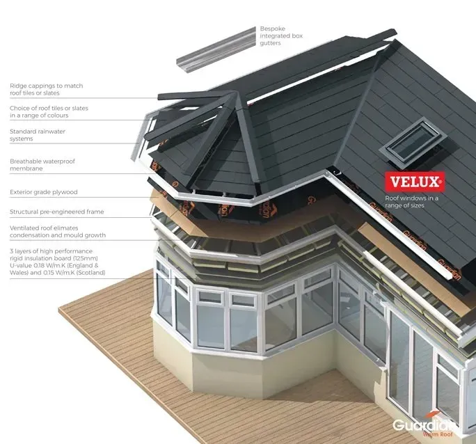 A Guardian Warm Roof is a thermally insulated roof system that significantly improves the energy efficiency of your conservatory. It also features Velux windows for enhanced natural light.
